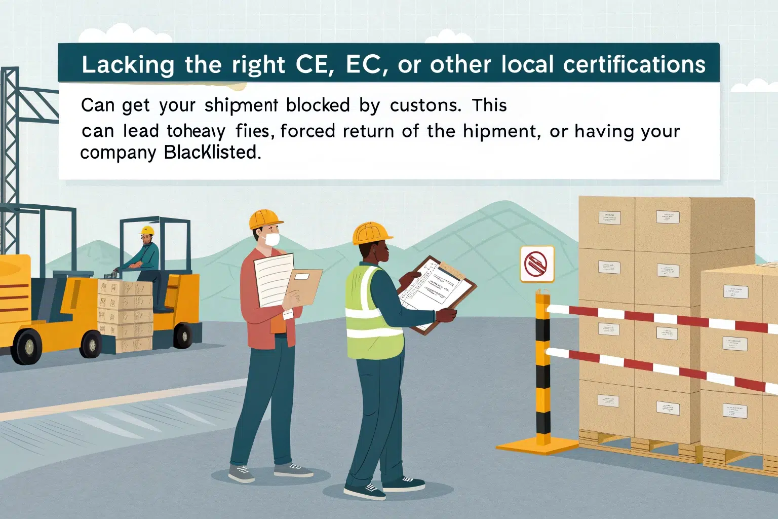 Lacking the right CE, EEC, or other local certifications can get your shipment blocked by customs. This can lead to heavy fines, forced return of the shipment, or having your company blacklisted.