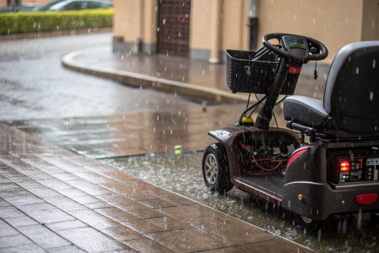 Bahkan hujan ringan pun bisa menjadi masalah. Kebanyakan skuter mobilitas tidak sepenuhnya kedap air. Air dapat merembes ke dashboard anakan dan konektor kelistrikan sehingga menyebabkan korsleting dan karat. Hanya model dengan rating IPX4 atau lebih tinggi yang tahan terhadap percikan.