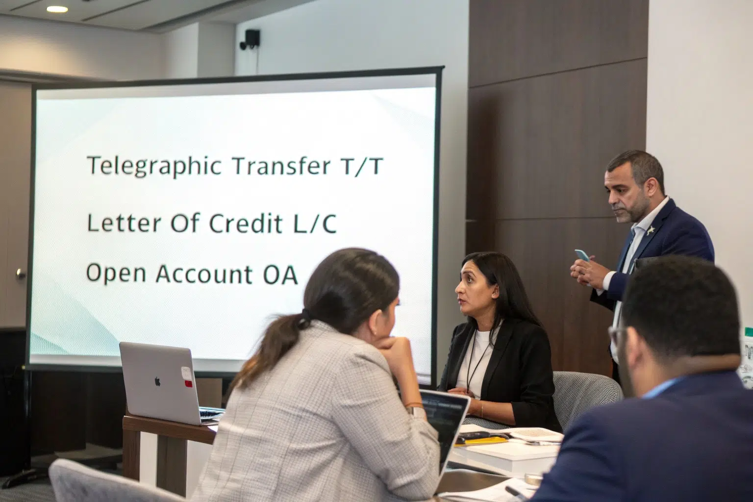 Төлемнің негізгі үш шарттары - телеграфтық тасымалдау (т / т), аккредитив (л) және ашық шот (OA). T / T - бұл ең икемді және қарапайым, L / C үлкен мәмілелер үшін барынша қауіпсіздікті ұсынады, ал OA ұзақ мерзімді, сенімді серіктестерге арналған.