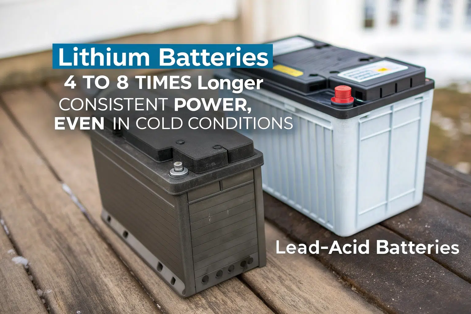 Литиевые батареи намного легче, служат в 4–8 раз дольше и обеспечивают более стабильную мощность, чем свинцово-кислотные батареи. Они также лучше работают в холодную погоду. Свинцово-кислотные аккумуляторы тяжелее и имеют более короткий срок службы, но это проверенная и надежная технология.